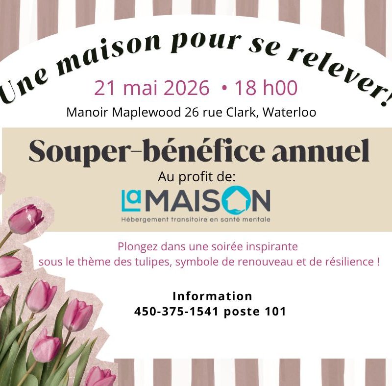 Le 21 mai prochain, joignez-vous à nous pour le souper-bénéfice annuel de la Maison d’hébergement transitoire en santé Mentale RSSM, sous le thème des tulipes, symbole de renouveau et de résilience.